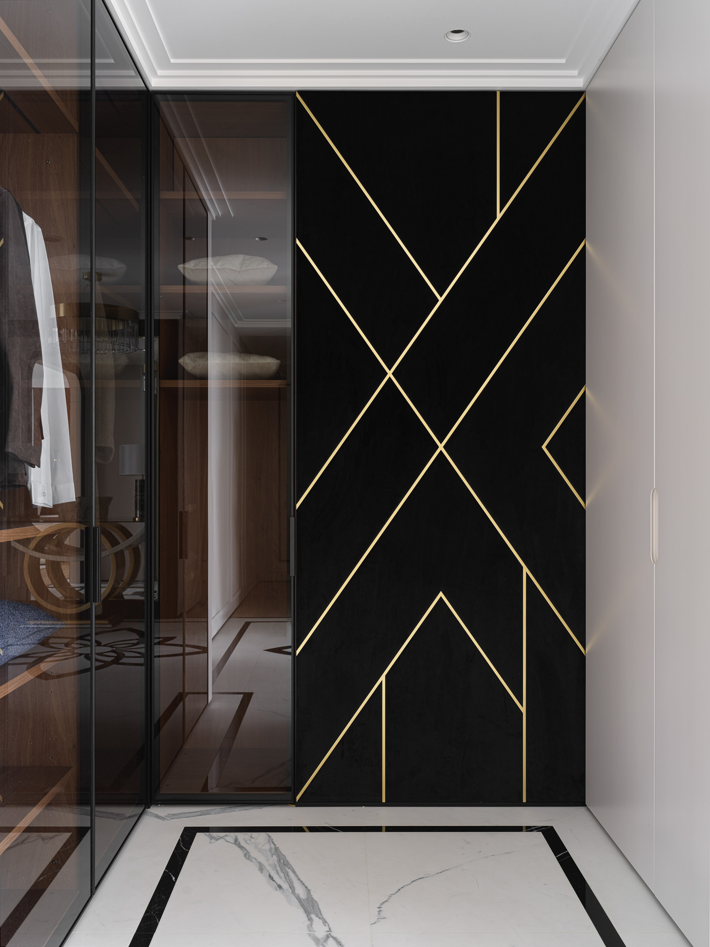 Баланс достигается за счёт контраста строгой архитектурной базы (пол, стены,потолок без излишнего декора) и акцентных материалов — латуни, зеркал,фрезерованных панелей, текстиля. Интерьер подчёркивает статус, оставаясь при этом спокойным и ненавязчивым.