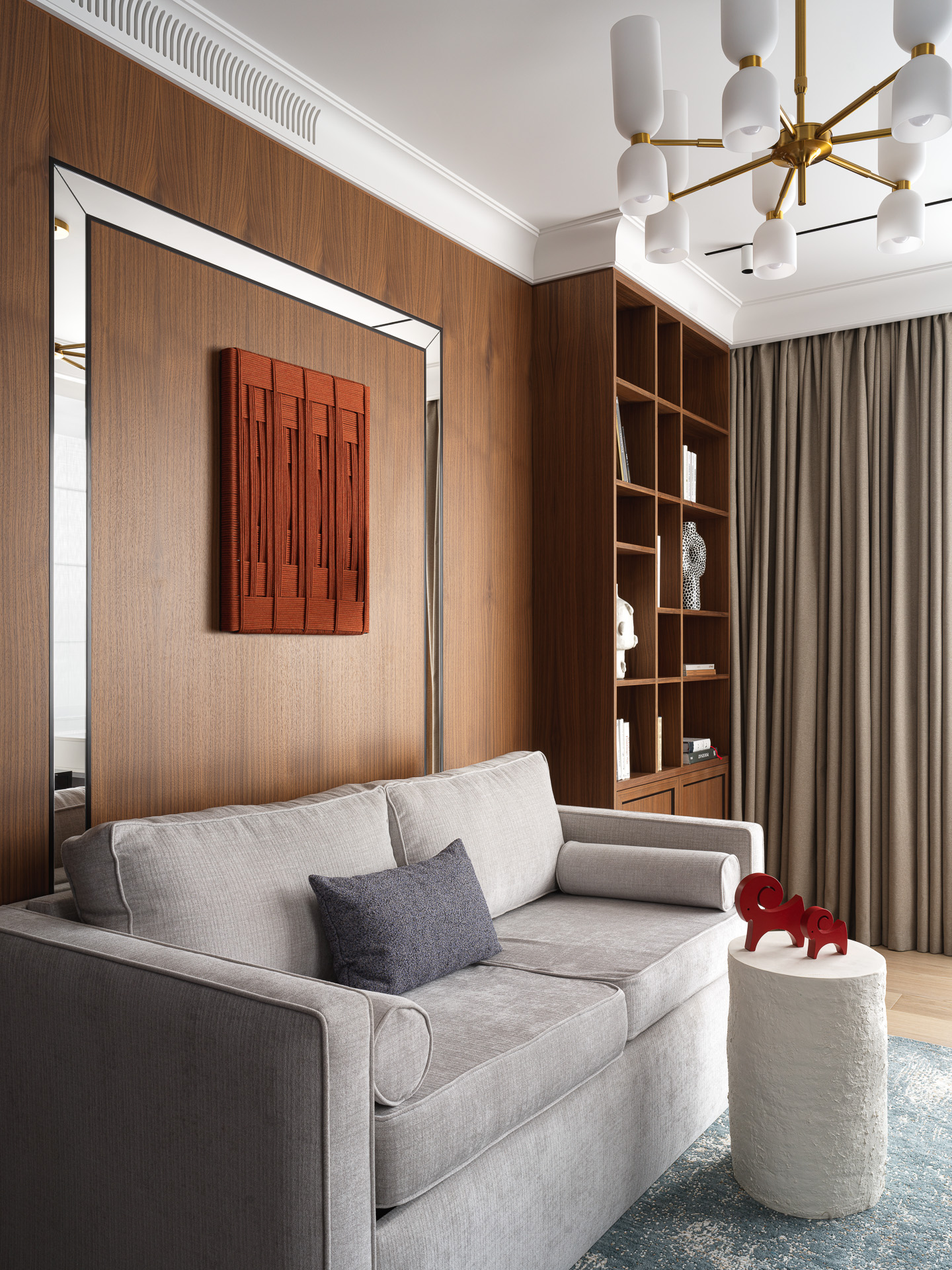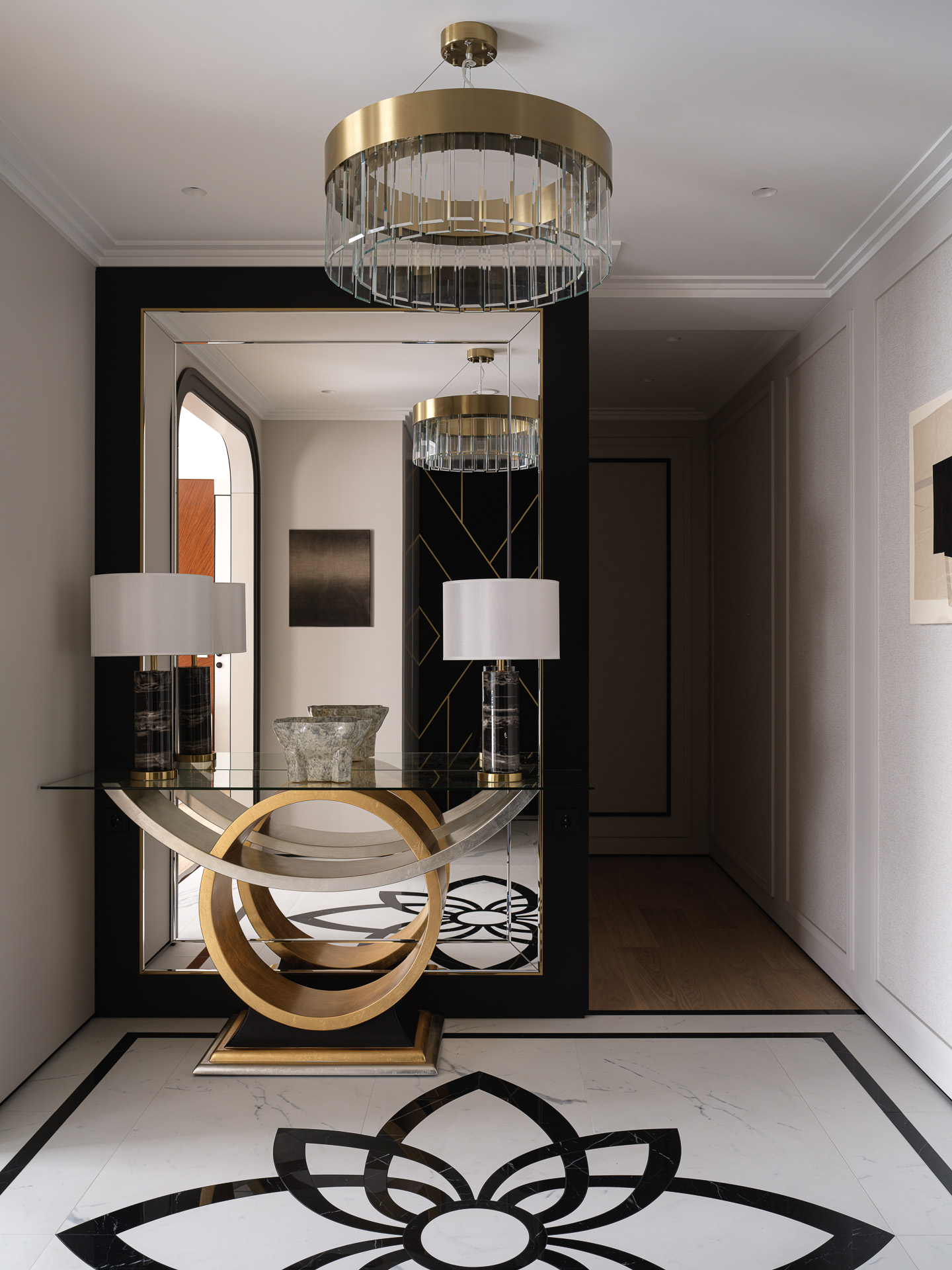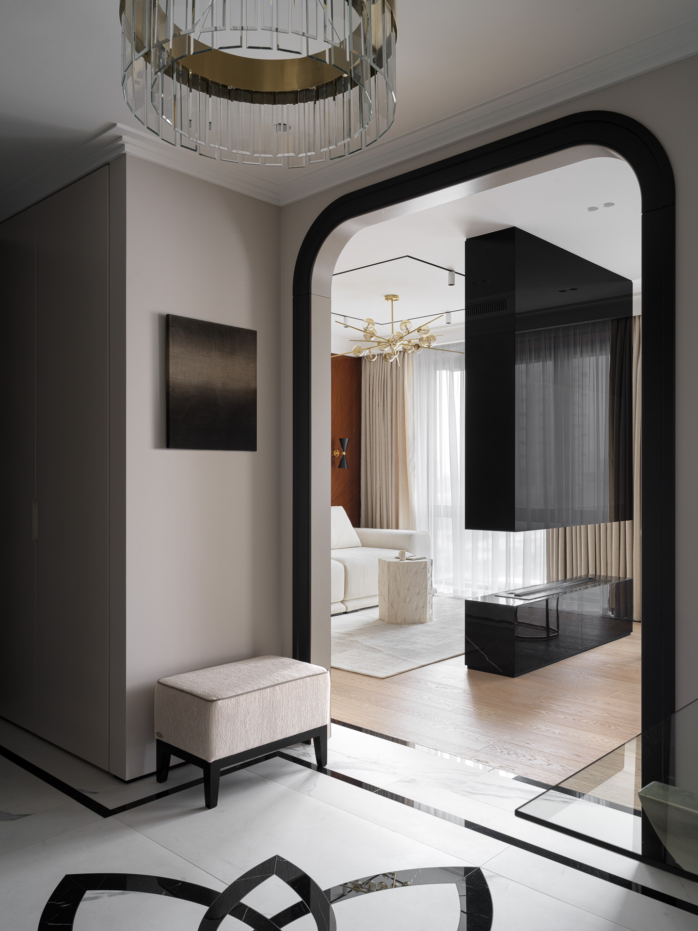Этот интерьер — редкий для современной городской среды пример тонко выверенного ар-деко, адаптированного под комфортную повседневную жизнь. Несмотря на доминирование минимализма в актуальных интерьерах, заказчики стремились к более выразительной, элегантной атмосфере — без избыточной декоративности, но с характером и статусом.