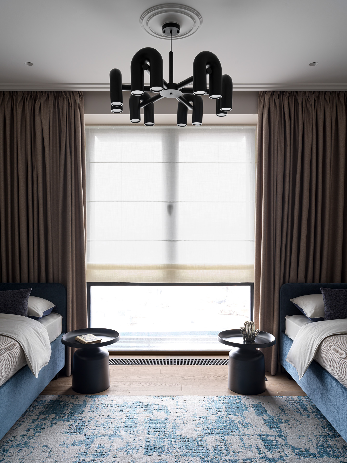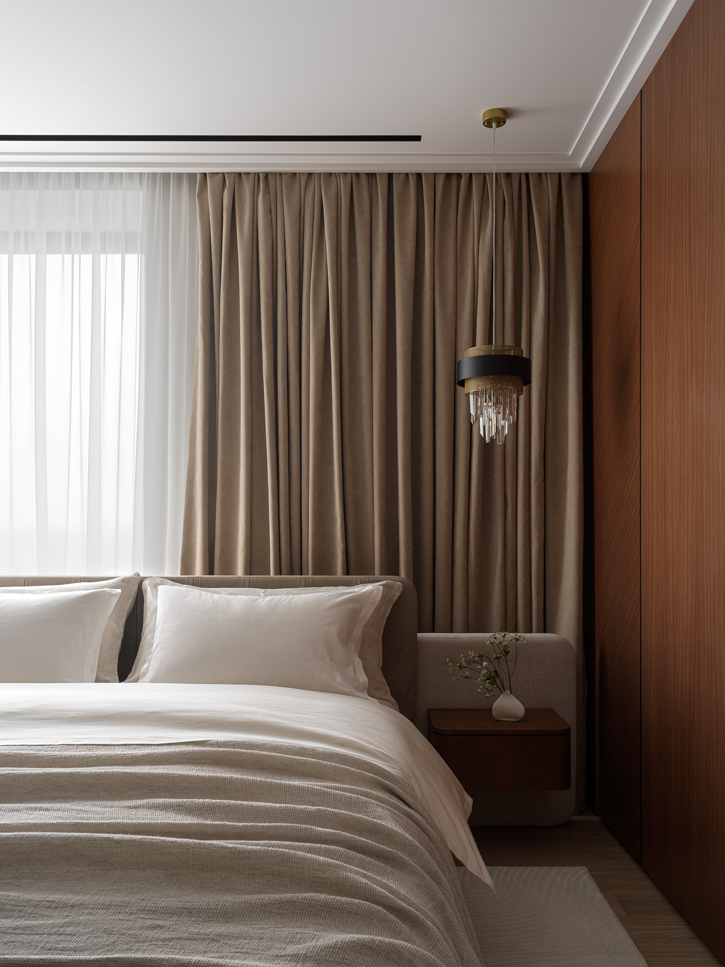 Геометрия помещения и расположение окон продиктовали нестандартное решение —кровать размещена изголовьем к окну. Это позволило сохранить симметрию,обеспечить удобные проходы и грамотно выстроить ТВ-зону.
