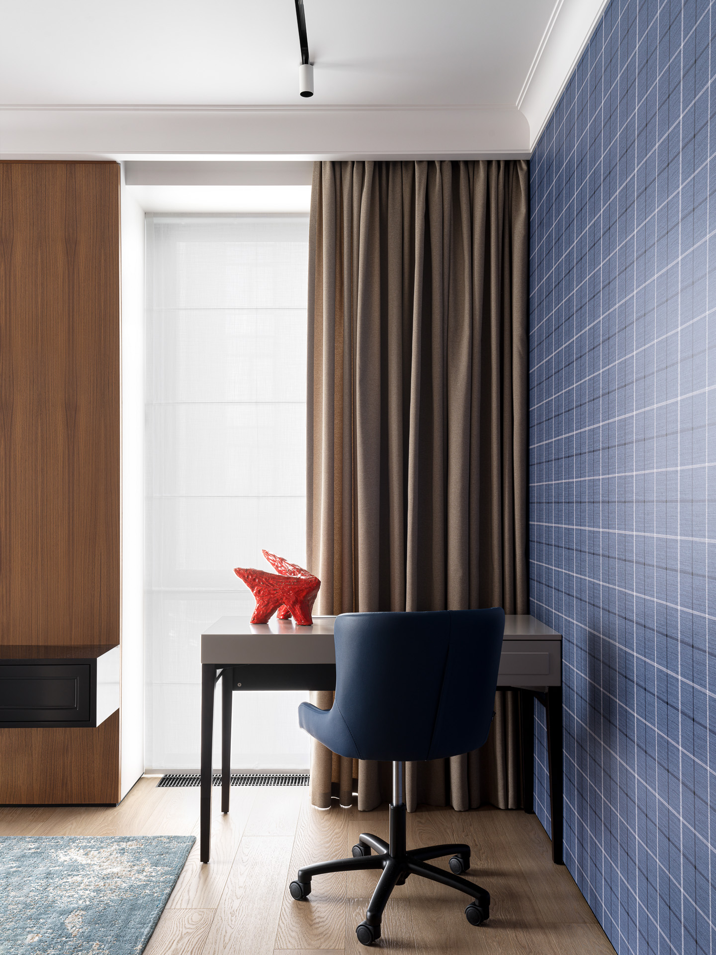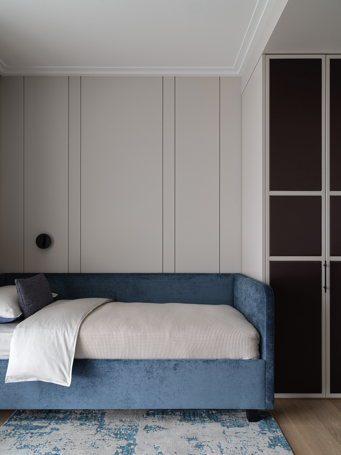 Комната спроектирована с возможностью трансформации: при необходимости она легко становится полноценной детской. Интерьер здесь ближе к ар-деко — используются МДФ-панели, контрастные вставки и акцентные обои в клетку. По всему пространству применён теневой плинтус, обеспечивающий чистую архитектурную линию.