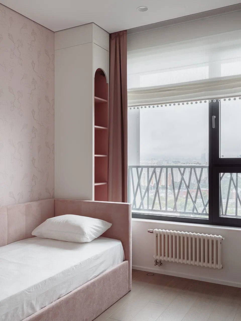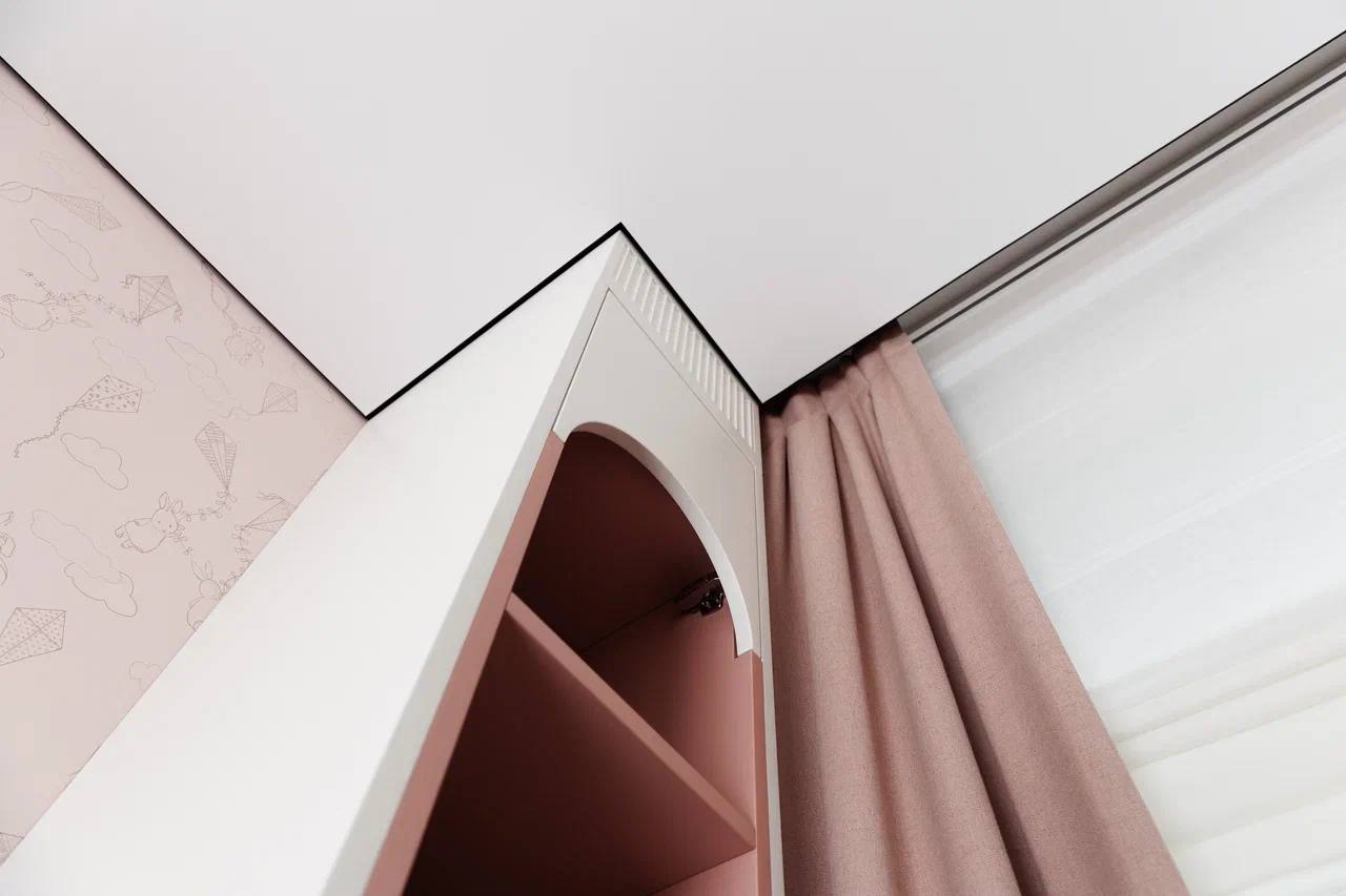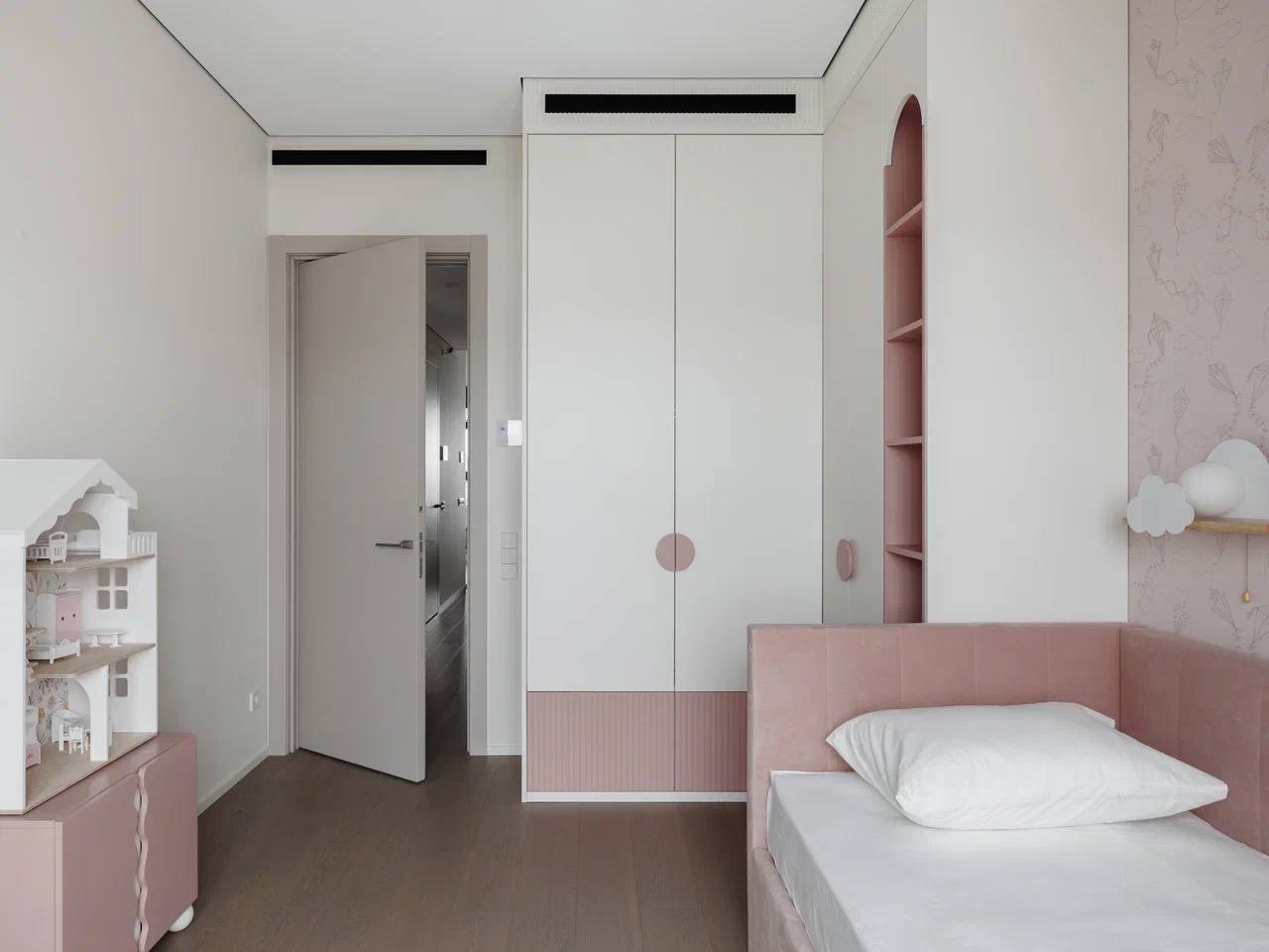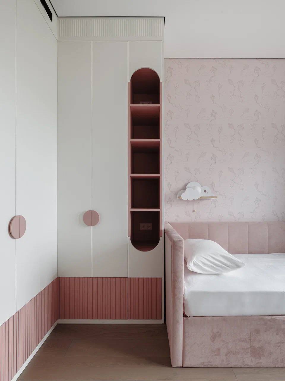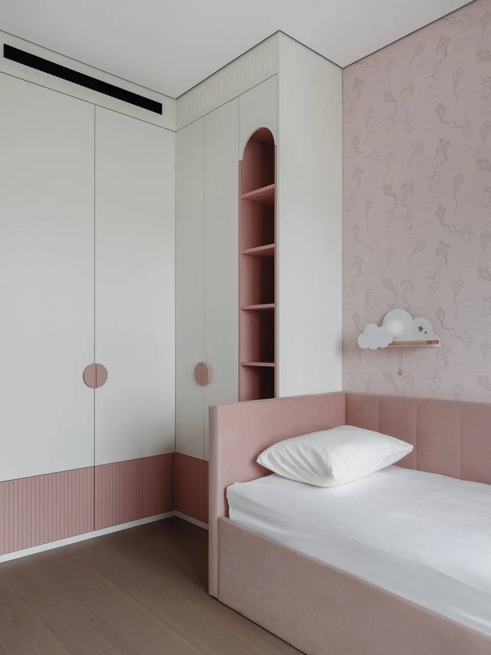 Детская – одна из удачных интерпретаций идеи “на вырост”. Нежно-розовая комната поддерживает хрупкий детский мир и мечты, не задавая тон всей квартире. Сегодня это мягкие пудровые оттенки, домик-кукла и полки-ниши, а завтра – рабочая зона у окна и большая зона для хранения книг. Мы заранее вывели розетки в зоне предполагаемого письменного стола и оставили модульность в полках, чтобы в будущем трансформация заняла не месяцы, а пару вечеров монтажа.