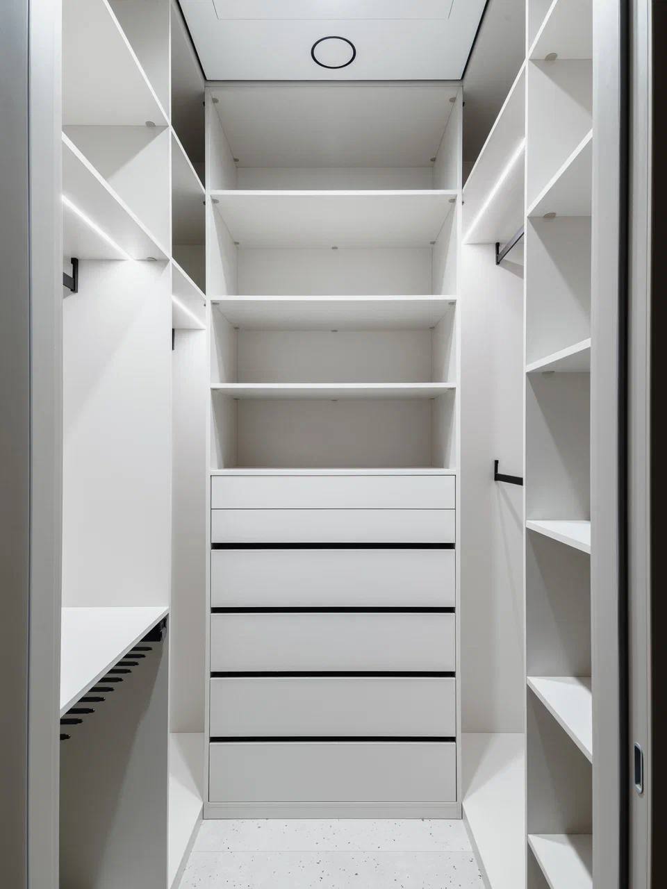 Чтобы не перегружать спальню зоной хранения и сохранить пространство, мы спроектировали отдельную гардеробную. Просторная и продуманная, она помогает поддерживать порядок и визуальную чистоту в доме.