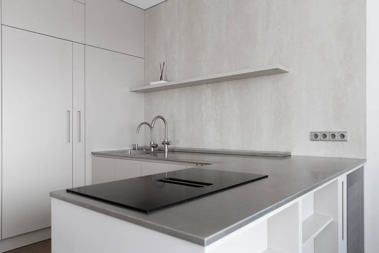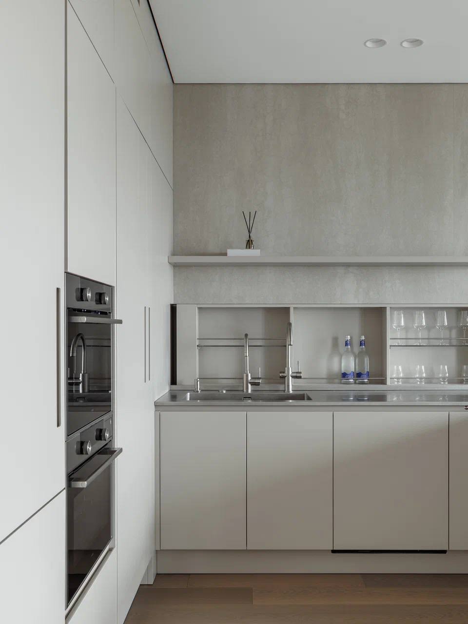 Визуально кухня остается “чистой” и без лишних деталей благодаря подъемному механизму RetroTop – это скрытые функциональные секции с удобным доступом к хранению. Здесь техника прячется в линию, а поверхность остается нетронутой.